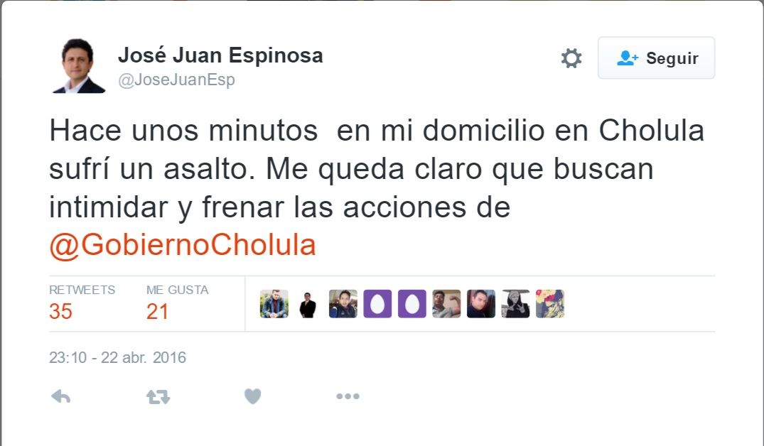 El presidente municipal de San Pedro Cholula, Juan Espinosa Torres, señaló la pasada noche de viernes que había sido víctima de robo a casa habitación, donde le fue sustraído, de una caja fuerte al interior de su vivienda, aproximadamente 120 mil pesos, así como un revólver.