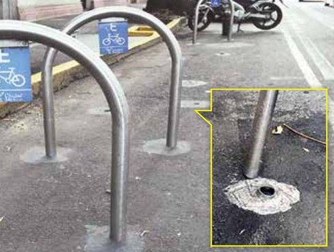 Mostraron a través de fotografías los cortes en la parte baja de las “U” invertidas donde los usuarios de este transporte dejan sus bicicletas. Los cortes al parecer están hechos con una segueta y es la trampa perfecta que facilita el trabajo a los delincuentes.
