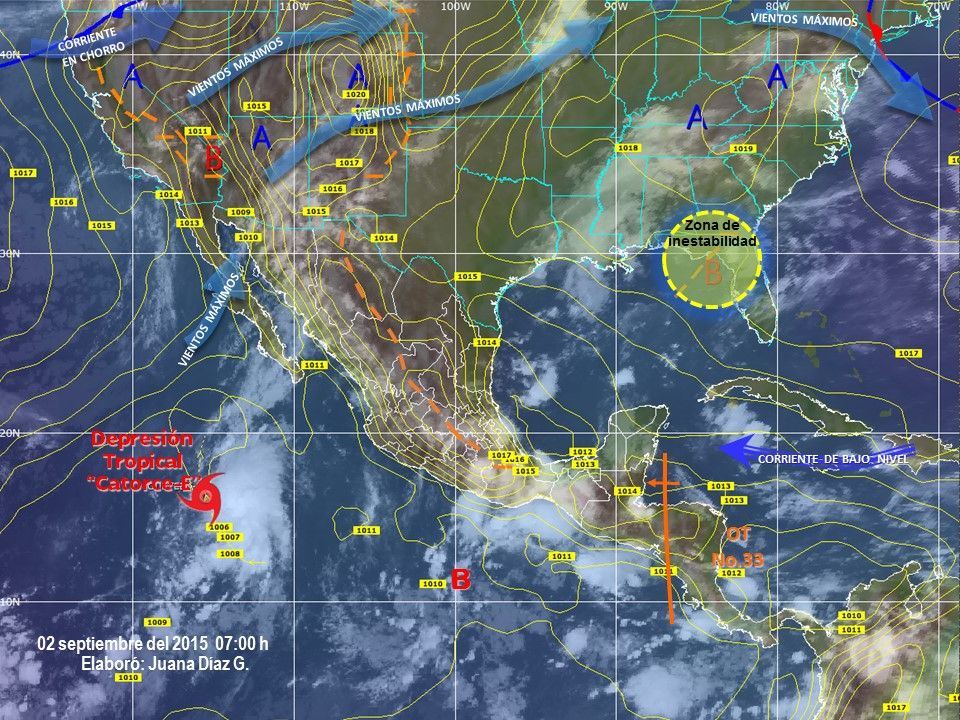 El Servicio Meteorológico Nacional (SMN) informó que la depresión tropical Catorce-E se encuentra al sur suroeste de Baja California Sur y continúa sin afectar al país.