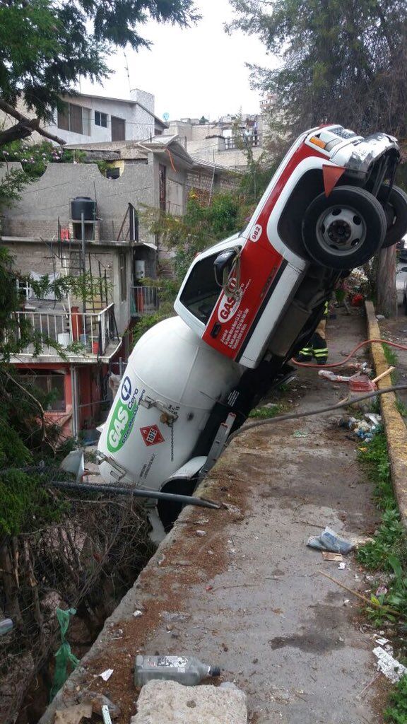 Una pipa de gas perdió el control en calles de Tlalnepantla, Estado de México, por lo que estuvo a punto de caer en una sanja; no se reportan lesionados.