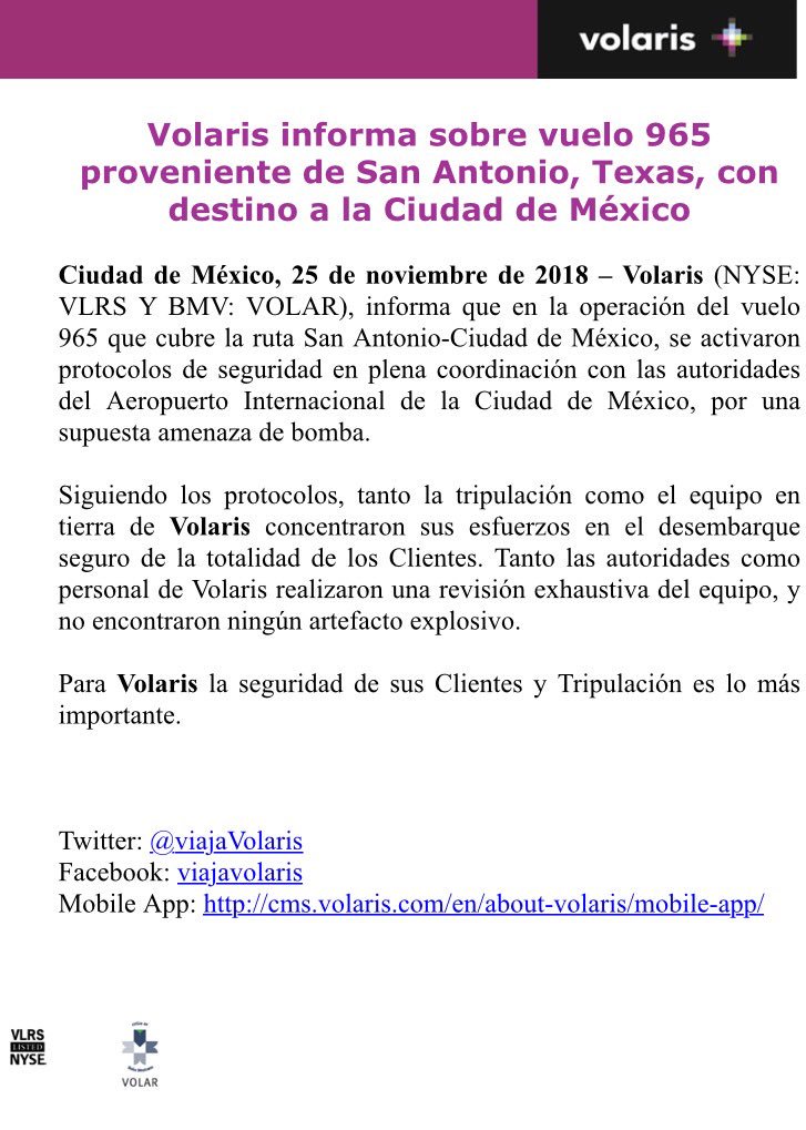 “Tanto las autoridades como personal de Volaris realizaron una revisión exhaustiva del equipo y no encontraron ningún artefacto explosivo”, señaló.