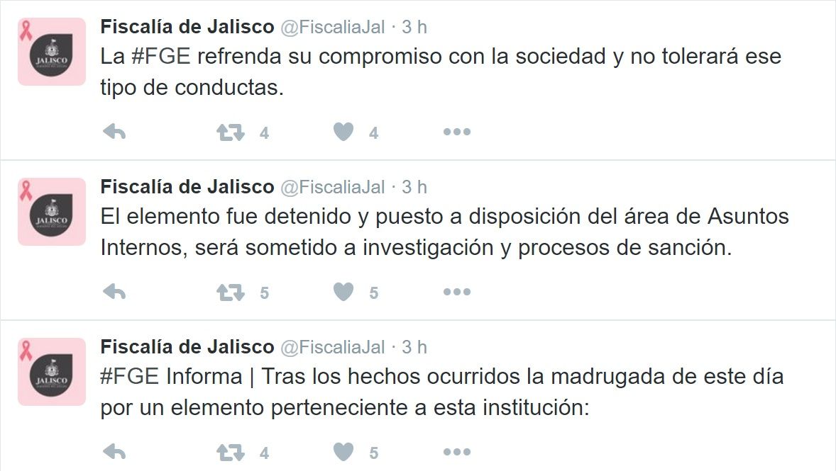 “#FGE Informa | Tras los hechos ocurridos la madrugada de este día por un elemento perteneciente a esta institución: El elemento fue detenido y puesto a disposición del área de Asuntos Internos, será sometido a investigación y procesos de sanción. La #FGE refrenda su compromiso con la sociedad y no tolerará ese tipo de conductas”, señaló.