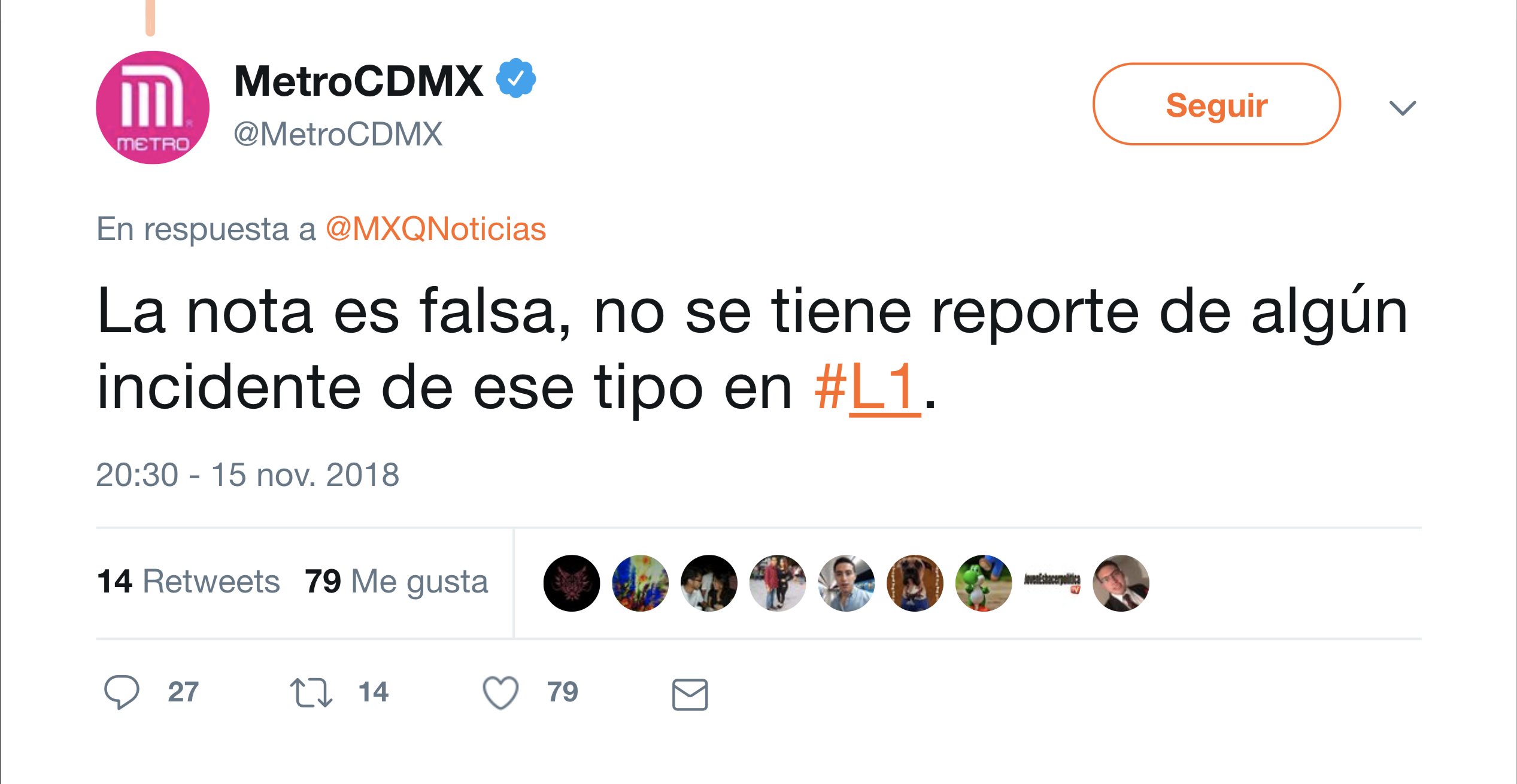 “La nota es falsa, no se tiene reporte de algún incidente de ese tipo en la Línea 1”, señaló el sistema de transporte público a través de su cuenta de Twitter.
