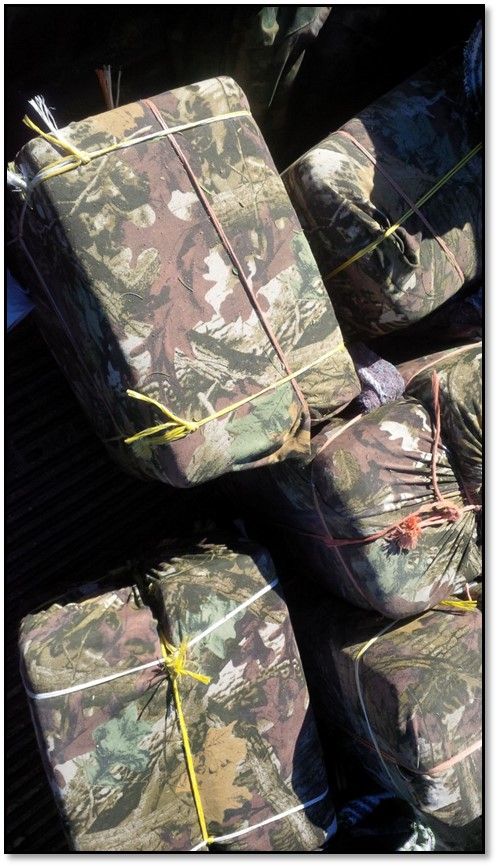 En total fueron detenidos 22 presuntos integrantes de este grupo criminal, a quienes se les aseguraron diversos paquetes y mochilas con camuflaje, las cuales contenían un estimado de 250 kilos de hierba seca compactada con las características de la mariguana.
