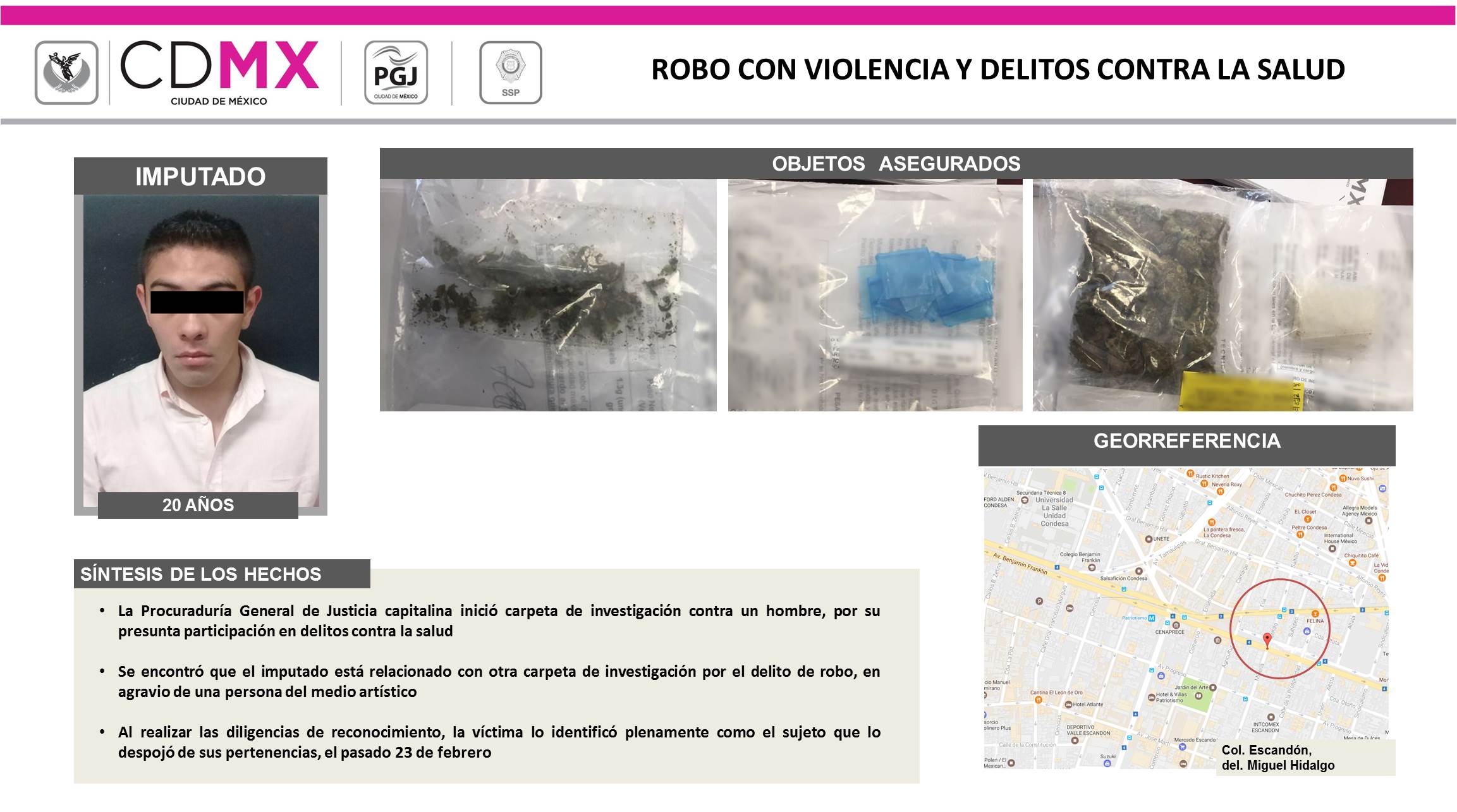 En la delegación Miguel Hidalgo autoridades capitalinas arrestaron a un sujeto en posesión de droga, que además podría ser el responsable de asaltar con violencia a un conductor de televisión, el pasado 23 de febrero en la colonia Escandón.