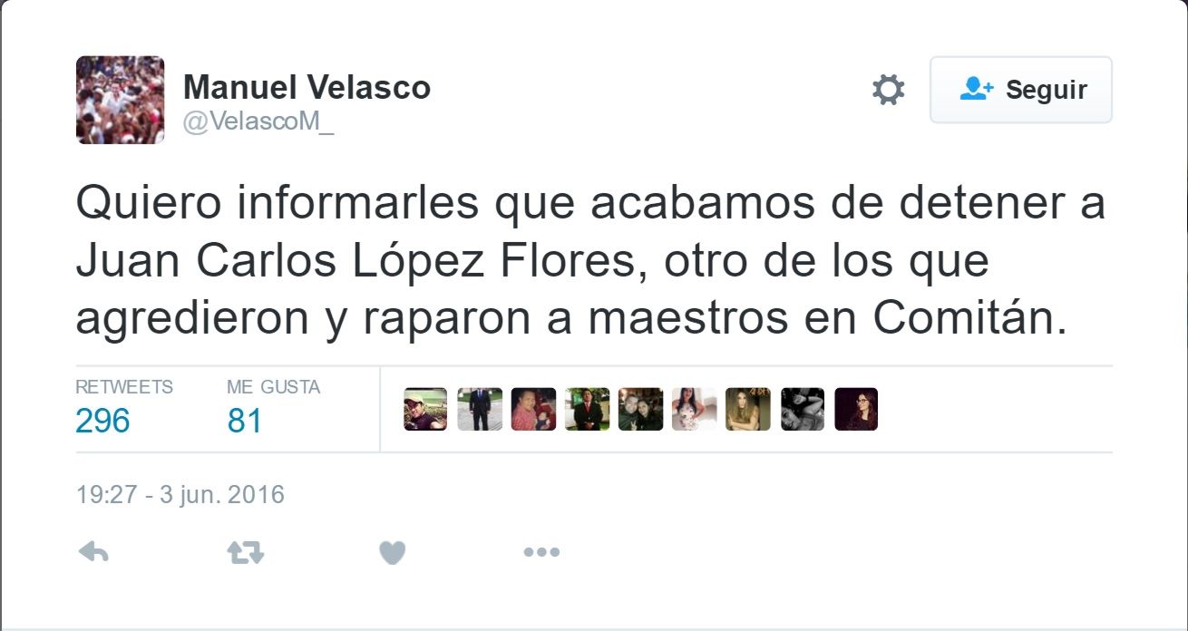 Así lo informó el gobernador de la entidad, Manuel Velasco Coello, quien además señaló la identidad del detenido, cuyo nombre es Juan Carlos López Flores, “otro de los que agredieron y raparon a maestros en Comitán”.