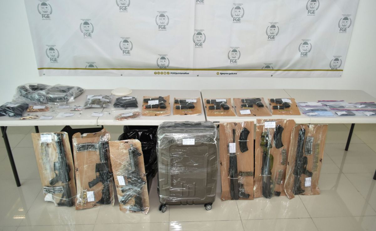 Arsenal y drogas decomisadas a ‘el Rayo’ en Benito Juárez. Foto de FGE Quintana Roo