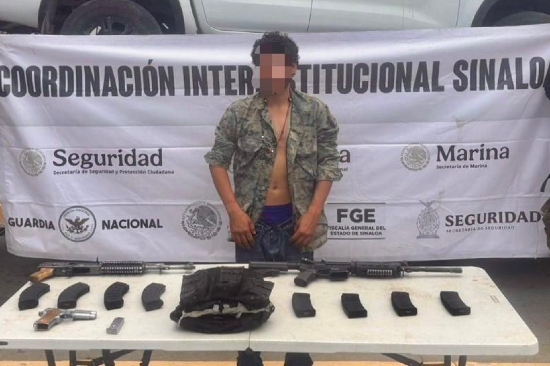 Autoridades de Sinaloa detuvieron a un hombre en la sindicatura de Villa Juárez de Navolato, Sinaloa, asegurándole un arsenal y una camioneta robada.