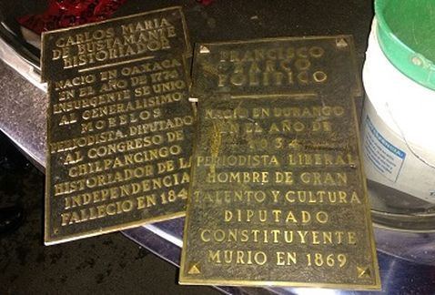 Las placas corresponden a los mausoleos del periodista liberal Francisco Zarco y al historiador de origen oaxaqueño, Carlos María de Bustamante.