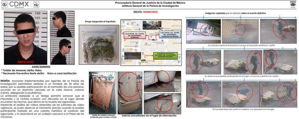 Con ayuda de cámaras de vigilancia privadas y del programa Ciudad Segura, policías de Investigación de la Procuraduría General de Justicia de la Ciudad de México ubicaron y detuvieron a un sujeto de 33 años de edad que presuntamente mató a otro en la calle Meave del Centro Histórico.