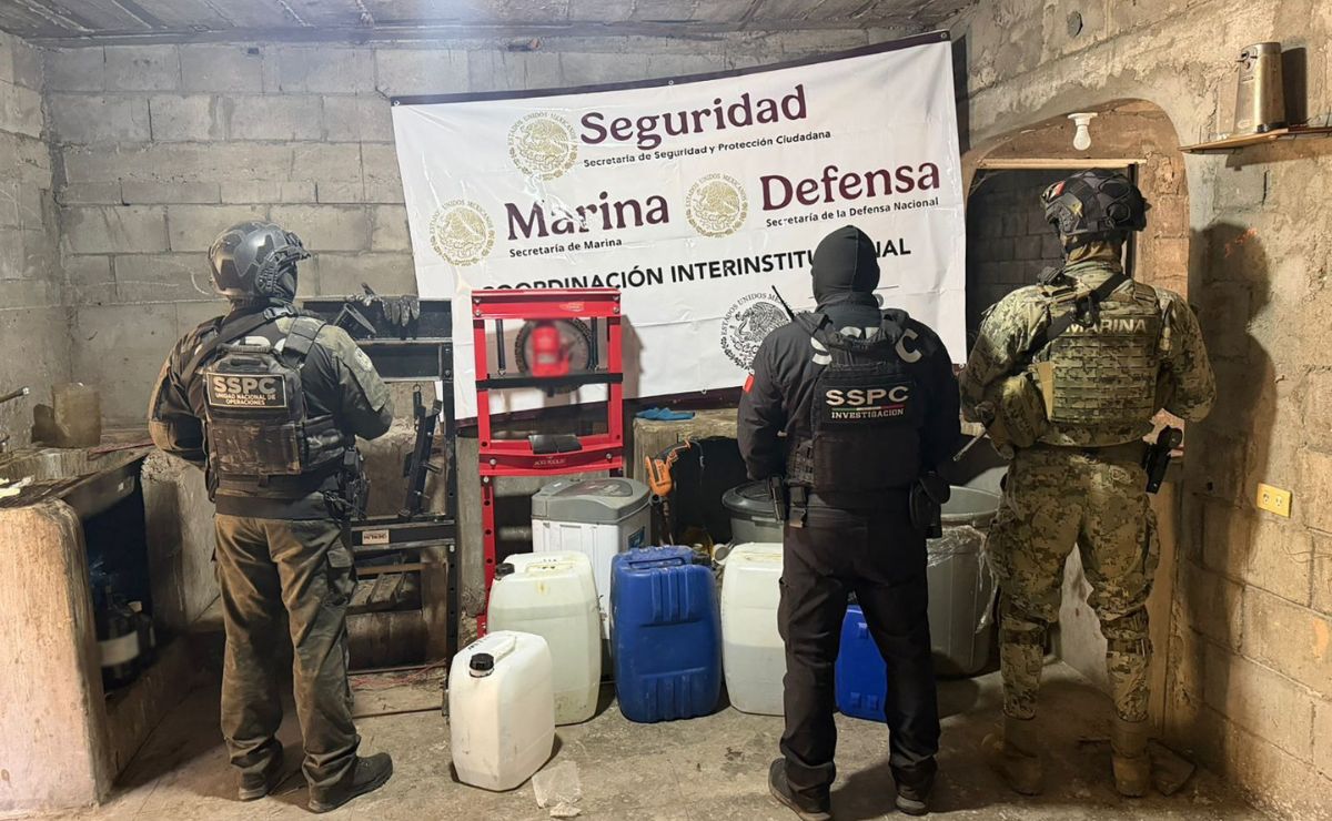 En el lugar se hallaron dos máquinas para la elaboración de tabletas, ollas de peltre y contenedores con más de 500 litros de sustancias químicas para la producción de drogas sintéticas.