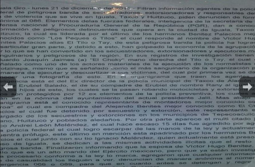 El nombre y fotografía fue difundido a través de volantes pegados por personas desconocidas en las calles del Zócalo de Iguala. En bardas y postes de la ciudad apareció un mensaje que incluye la foto de quien se asegura es ‘El Choky’, acompañada de un escrito hecho en computadora donde se señala que es la mano derecha de Víctor Hugo Benítez Palacios, delincuente apodado “El Tilo” o “El Tay”, jefe de la banda de ‘Los Peques’, vinculada al grupo delincuencial Guerreros Unidos, de quien se dice, en dicho documento, que es sobrino de un alto militar.