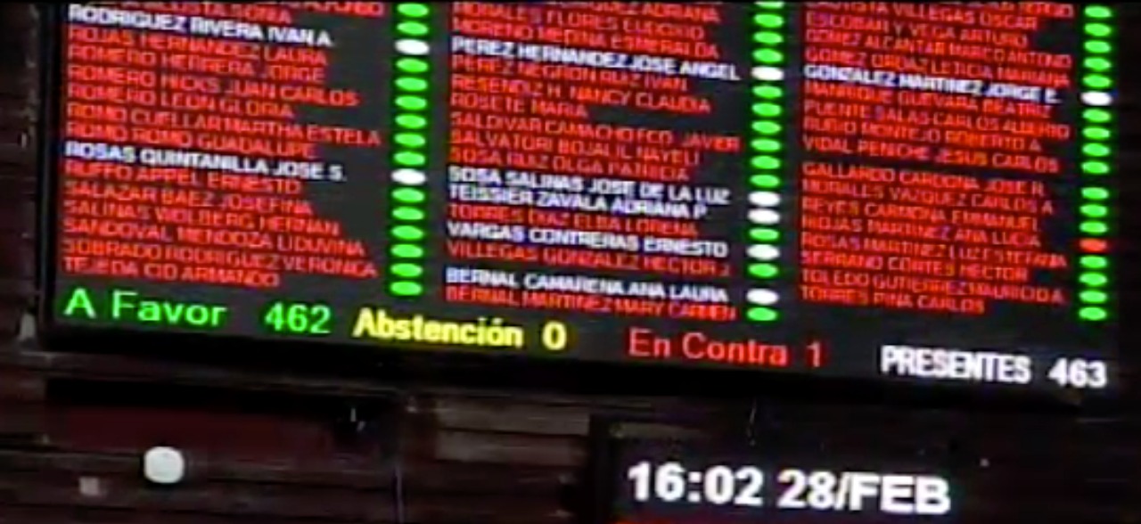 Con un solo voto en contra, el Pleno de la Cámara de Diputados aprobó la minuta de reforma constitucional que le envió el Senado de la República para la creación de la Guardia Nacional y la reforma al Artículo 43 de la Ley Orgánica de la Administración Pública Federal.