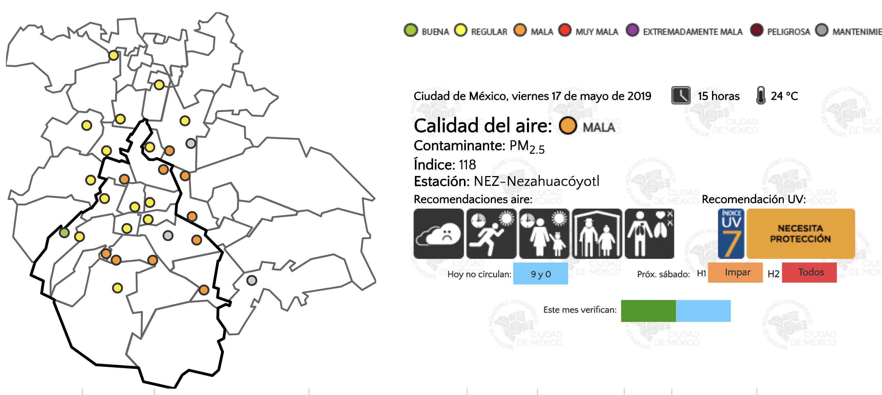 En su reporte de las 15:00 h, la calidad del aire es mala en el Valle de México con un máximo de 118 puntos de PM2.5 en la zona de Nezahualcóyotl.