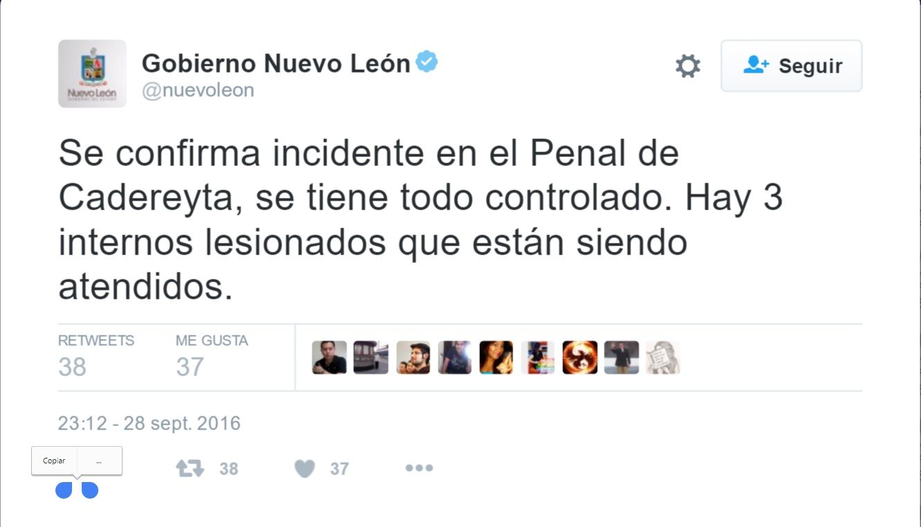 Tres reos lesionados es el saldo de una riña suscitada al interior del penal de Cadereyta Jiménez, en Nuevo León, así lo confirmó el gobierno del Estado a través de su cuenta de Twitter.