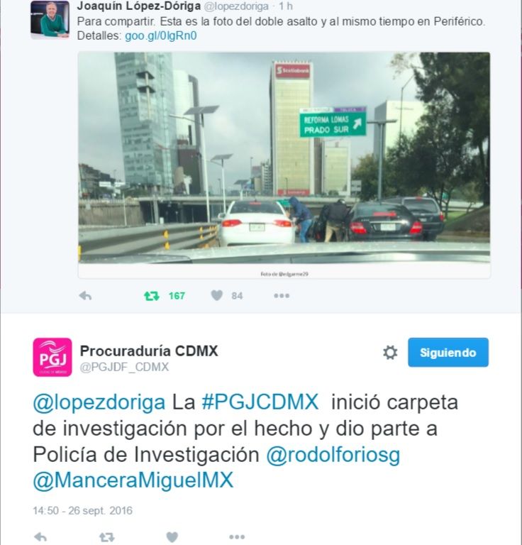 “@lopezdoriga La #PGJCDMX inició carpeta de investigación por el hecho y dio parte a Policía de Investigación @rodolforiosg @ManceraMiguelMX”, señala el tuit.