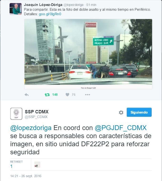 A través de su cuenta de Twitter, la Secretaría de Seguridad Pública (SSP) de la Ciudad de México señaló que “@lopezdoriga En coord con @PGJDF_CDMX se busca a responsables con características de imagen, en sitio unidad DF222P2 para reforzar seguridad”.