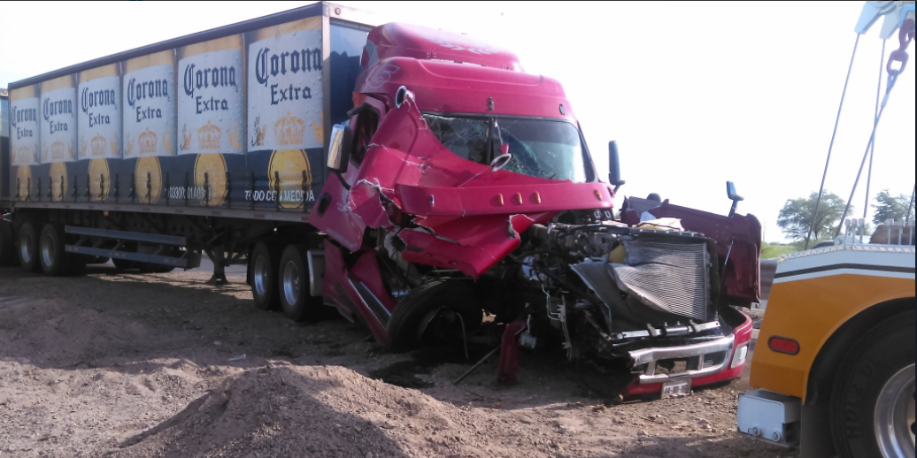 Un tráiler con doble remolque y cargado con envases para cerveza se accidentó debido a una falla mecánica que provocó que el conductor perdiera el control y chocara por alcance a la unidad que se desplazaba al frente y la cual pertenecía a la misma empresa.