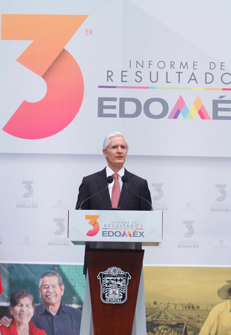 El Gobernador del Estado de México, Alfredo Del Mazo Maza, emitió un mensaje con motivo de su Tercer Informe de Resultados, donde indicó que ante los desafíos los mexiquenses se crecen y unidos hacen que el Estado de México no se detenga, por lo que con voluntad, solidaridad y trabajo en equipo, se construye un estado que es sinónimo de libertad, apertura, modernidad y oportunidades de desarrollo, superando obstáculos, imprevistos y desafíos.