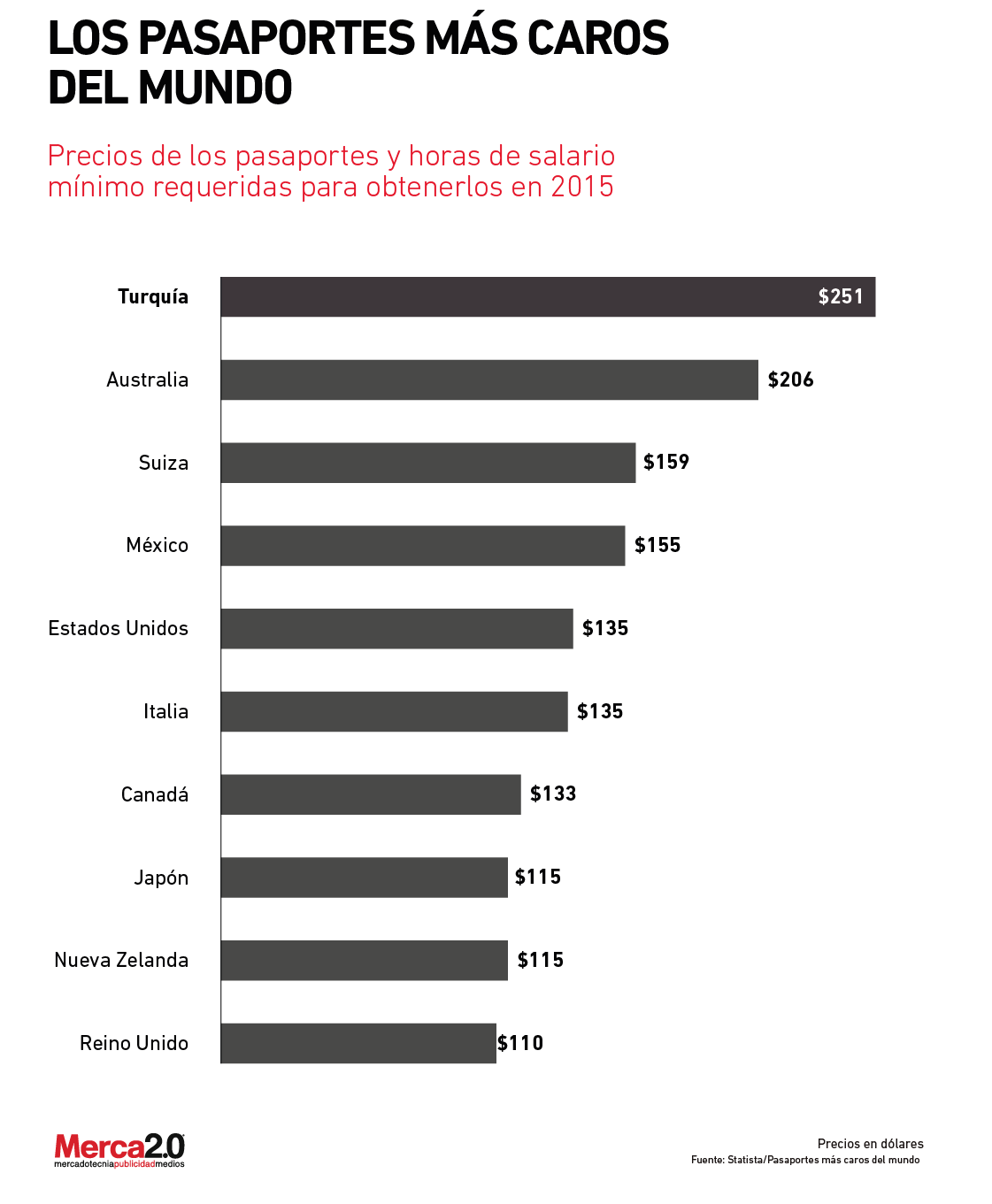 El pasaporte más caro es del de Turquía cuyo precio es de 251 dólares (4 mil 179 pesos), luego sigue el de Australia con 206 dólares (3 mil 430 pesos) y el suizo de 159 dólares (2 mil 647 pesos).
