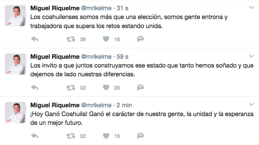 Por su parte, Miguel Riquelme, candidato del mismo partido para la gubernatura de Coahuila, también se declaró ganador de la contienda estatal.