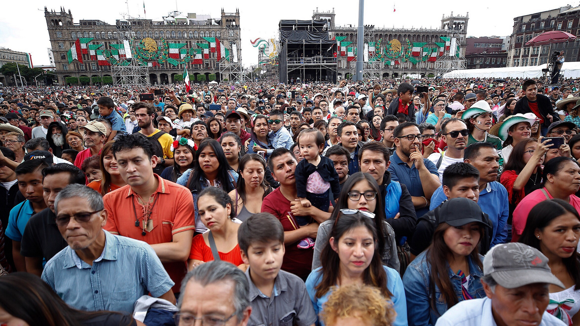 Familias mexicanas y visitantes extranjeros esperan en un Zócalo casi lleno la salida de Andrés Manuel López Obrador al balcón presidencial para a las 22:50 h corear las 20 arengas que lanzará el mandatario federal en el marco del 209 Aniversario del inicio de la Gesta de Independencia de México.