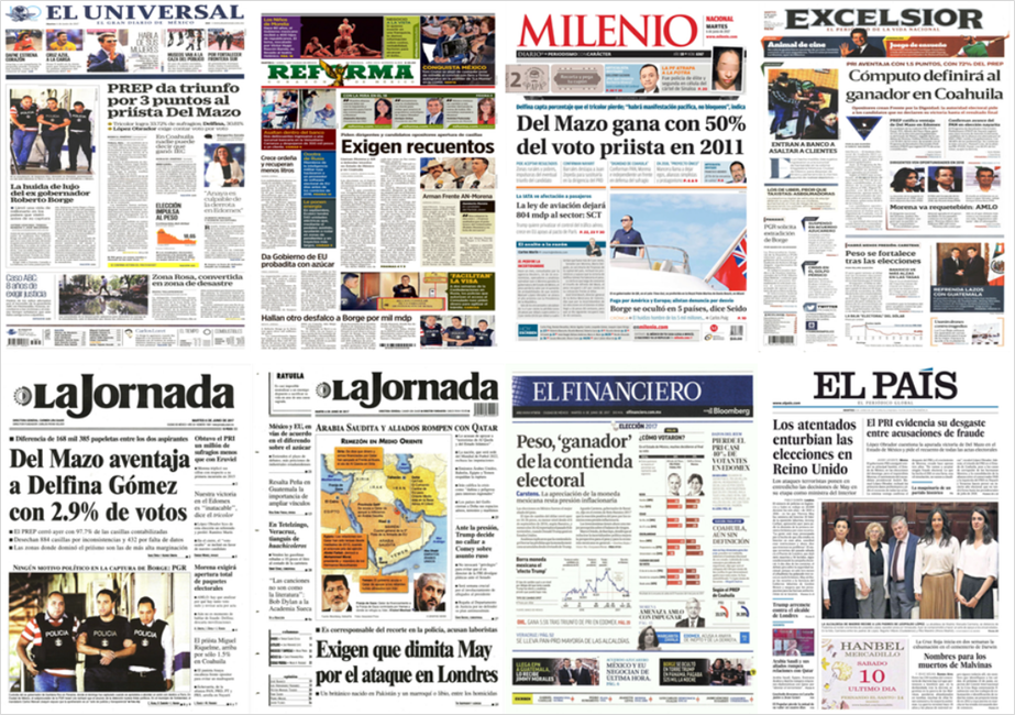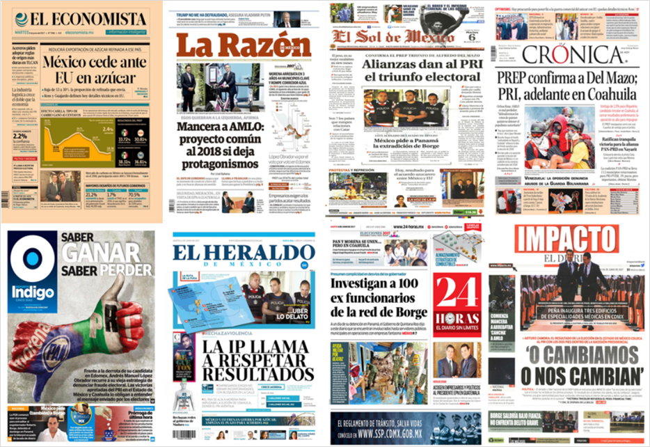 Los principales periódicos de México destacaron este martes en sus primeras planas que el candidato de los partidos Revolucionario Institucional, Verde, Nueva Alianza y Encuentro Social, Alfredo del Mazo Maza, mantiene la ventaja en el Programa de Resultados Preliminares (PREP), al sumar un millón 955 mil 347 votos, equivalente a 33.72 por ciento en el Estado de México.
