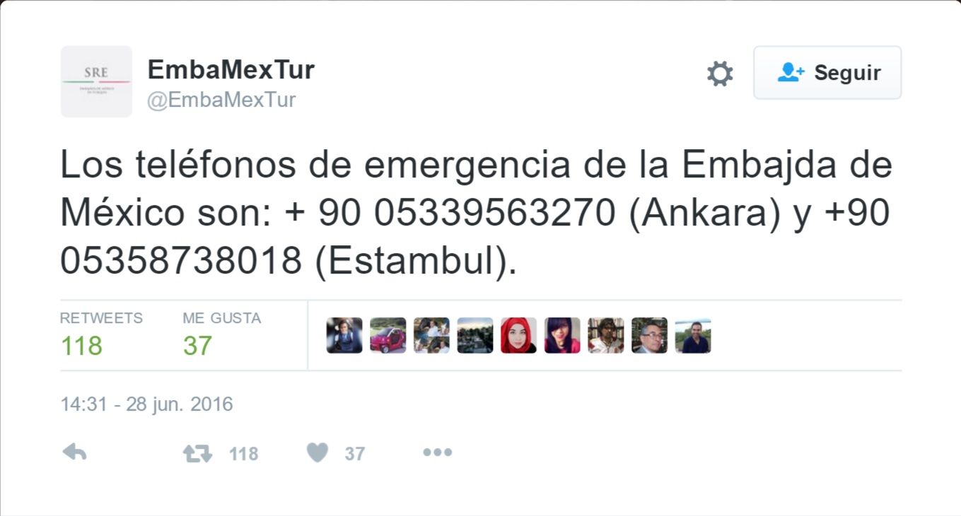 “Ante la explosión ocurrida en el aeropuerto de Estambul, en Turquía, la Embajada de México reitera que está a las órdenes de los mexicanos”, precisó en su cuenta de Twitter.