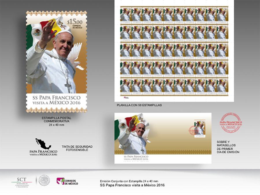 Con motivo de la visita del Papa Francisco, Correos de México emitió una estampilla postal conmemorativa, la cual será puesta en circulación en más de mil 450 oficinas postales del país.