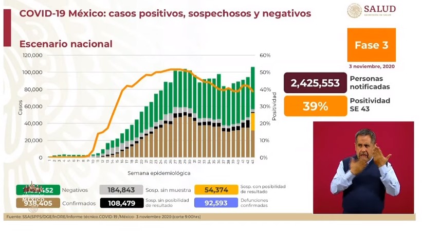 La Secretaría de Salud dio a conocer este martes que suman 938 mil 405 casos confirmados acumulados de COVID-19 en México, mientras que hay 92 mil 593 muertes por la enfermedad