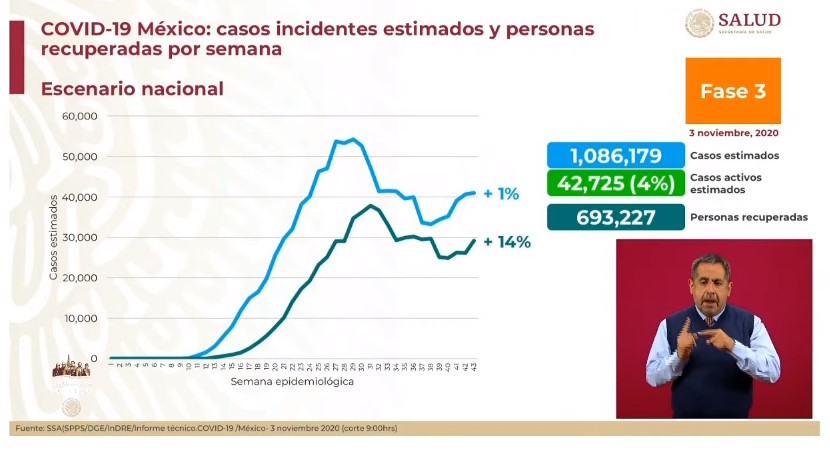 El número de casos activos se estima en 42 mil 725, el cuatro por ciento del total de casos, y el de recuperados es de 693 mil 227.