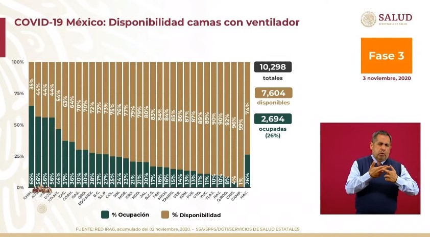 A nivel nacional la ocupación de camas de hospitalización general IRAG (Infección Respiratoria Aguda Grave) es del 33 por ciento, mientras que la de camas con ventilador es del 26 por ciento.