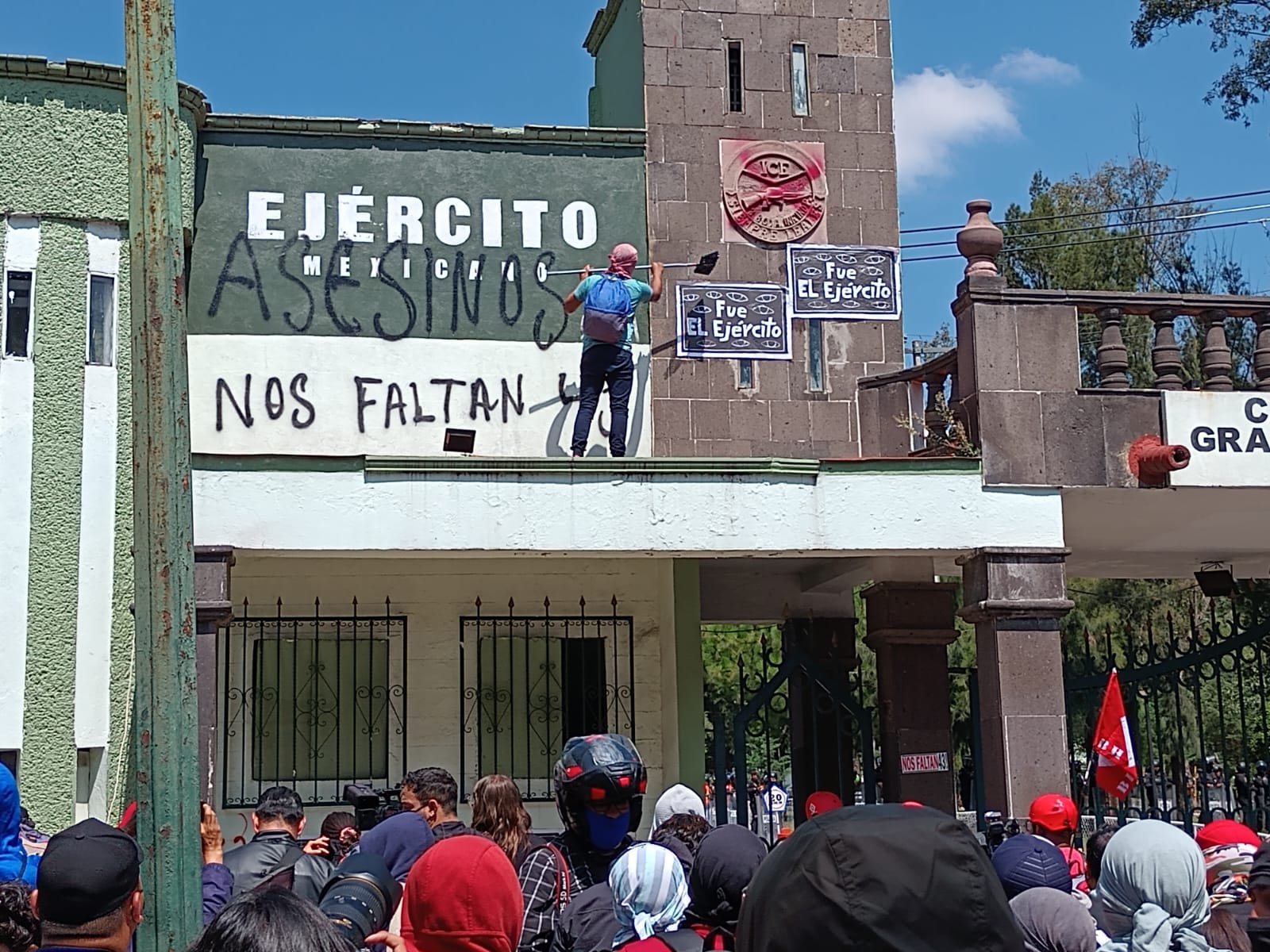 Tras el mitin, algunos manifestantes lanzaron cohetones y petardos a las instalaciones militares e, incluso, derribaron una de las puertas del Campo Militar Número Uno, mientras los elementos policiacos repelieron las agresiones con piedras y agua.