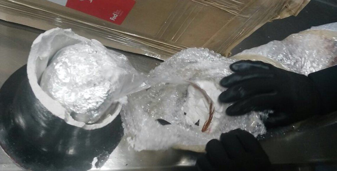 Como parte de las labores de inspección y seguridad que implementa la Comisión Nacional de Seguridad (CNS) en el Aeropuerto Internacional de Los Mochis, Sinaloa, elementos de la Policía Federal (PF) localizaron un empaque que contenía dos jarrones de yeso con una sustancia cristalina, aparentemente metanfetamina.