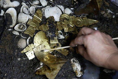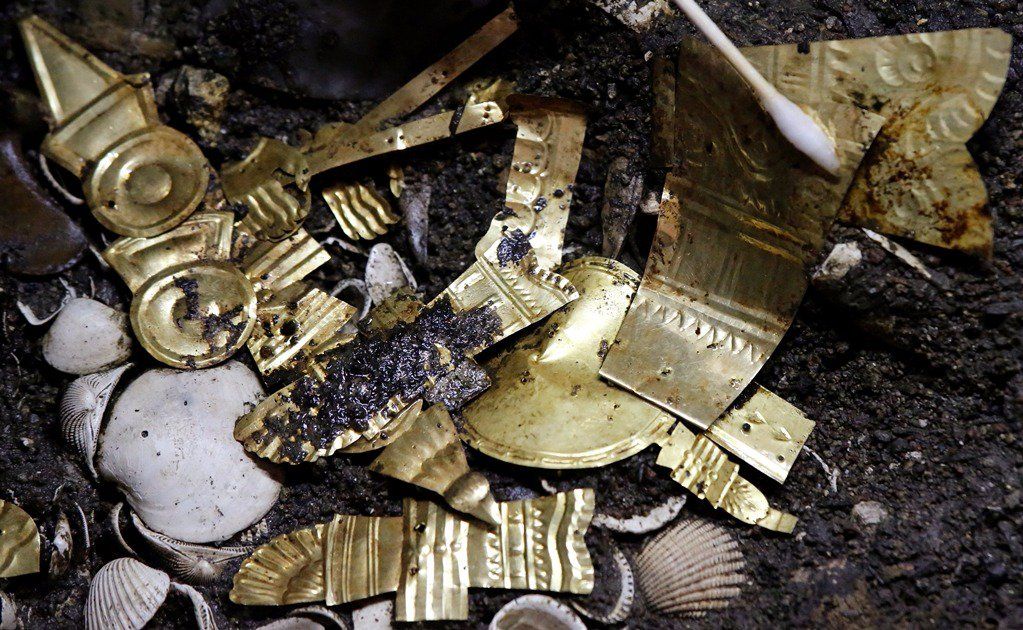 Leonardo López, arqueólogo a cargo, indicó que el descubrimiento consta de 22 piezas completas entre las que destacan unos pendientes y un pectoral en forma de disco, los cuales fueron fabricados con delgadas láminas de oro.