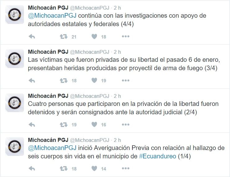 La Procuraduría General de Justicia (PGJE), a través de su cuenta de Twitter, informó que ha iniciado ya la averiguación previa correspondiente a la localización de los seis cuerpos sin vida, así como informó de la detención de cuatro presuntos responsables de la privación de la libertad de los ahora occisos.