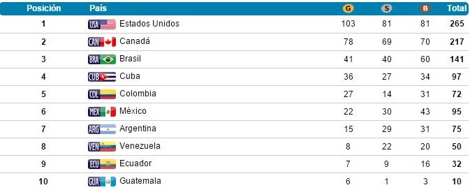 México quedó por debajo de Estados Unidos, quien logró 103 medallas de oro. Seguido de Canadá, Brasil, Cuba y Colombia; pero por encima de Argentina, Venezuela, Ecuador, Chile y Guatemala.