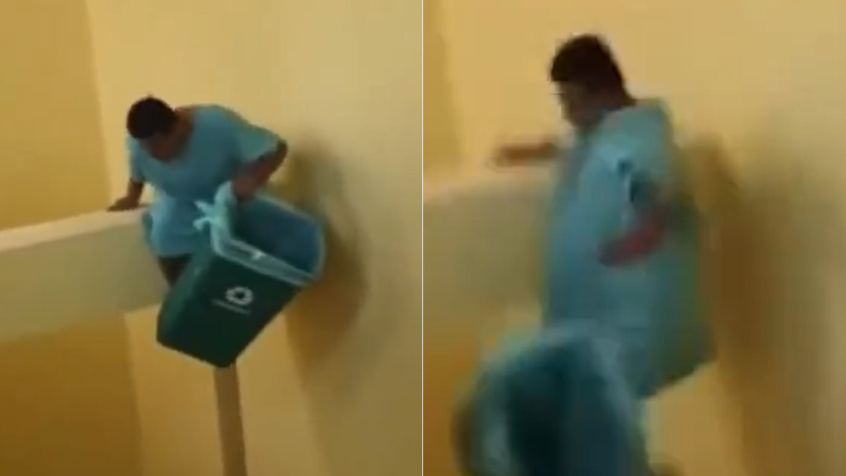 Un video compartido en redes sociales muestra el momento en que el hombre saltó de una viga en el hospital.