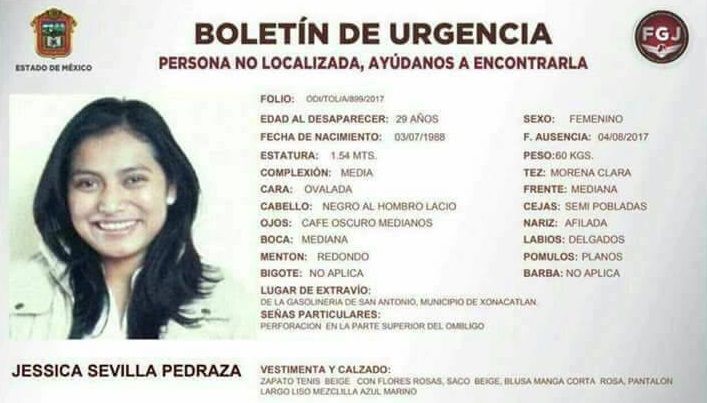 Sevilla Pedraza, de 29 años, fue vista por última vez el viernes por la tarde en una gasolinera del poblado de San Antonio, en Xonacatlán. Tras ser reportada como desaparecida, su cuerpo apareció el sábado en Huixquilucan.