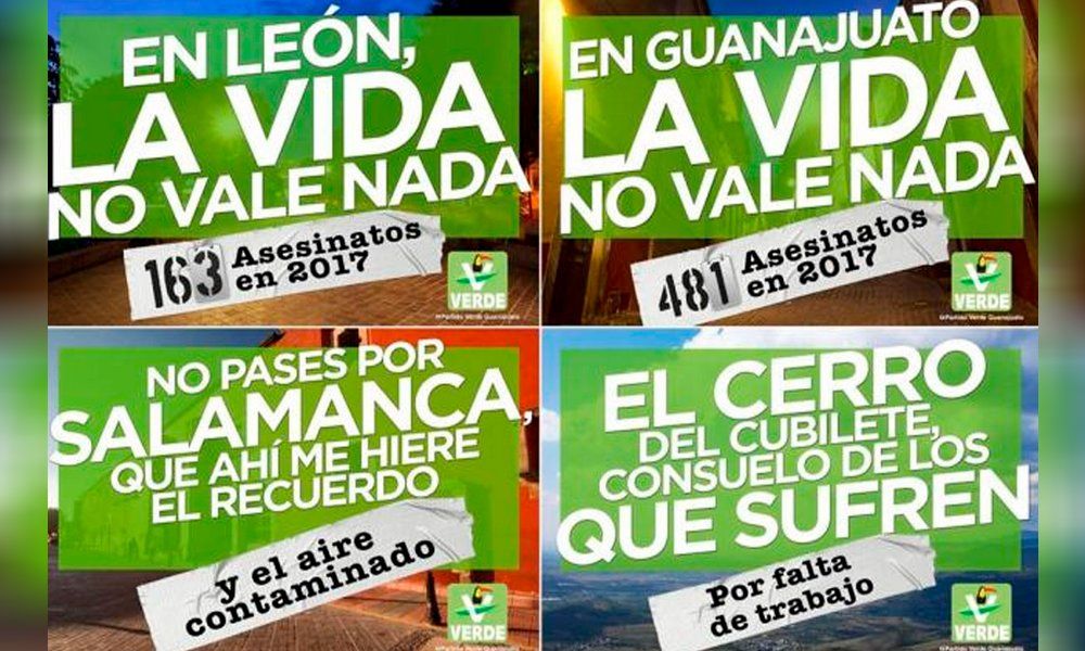 “No pases por Salamanca, que ahí me hiere el recuerdo y el aire contaminado”, “Caminos de Guanajuato que pasas por tantos pueblos inseguros y descuidados”, “En Guanajuato la vida no vale nada; 481 asesinatos en 2017”, son algunos mensajes utilizados en las campañas del Partido Verde y que pertenecen a la autoría de José Alfredo Jiménez.