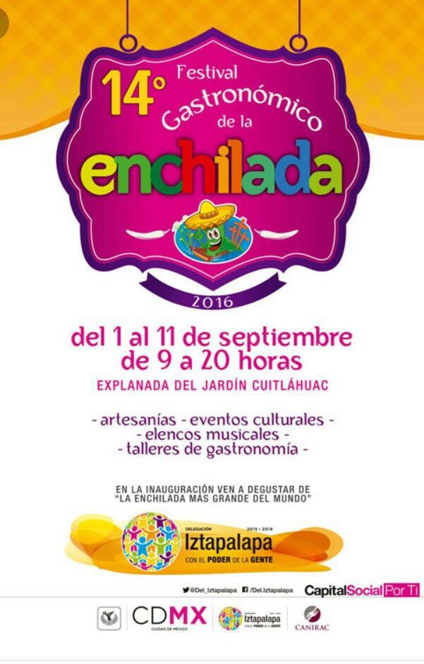 En la Macroplaza del Jardín Cuitláhuac encontrarán las enchiladas iztapalapenses (con charales), queretanas, oaxaqueñas, verdes, rojas, mole, así como las potosinas y veracruzanas.
