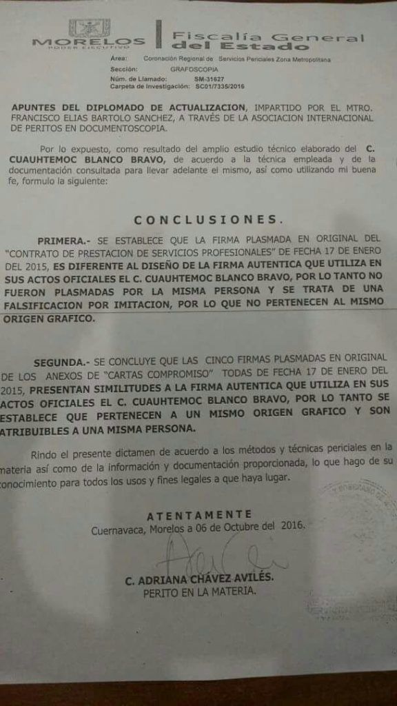 Según el peritaje: “se establece que la firma plasmada en original del ‘contrato de prestación de servicios profesionales’ de fecha 17 de enero del 2015, es diferente al diseño de la firma auténtica que utiliza en sus actos oficiales el C. Cuauhtémoc Blanco Bravo, por lo tanto no fueron plasmadas por la misma persona y se trata de una falsificación por imitación “, según el acta emitida por la Fiscalía.
