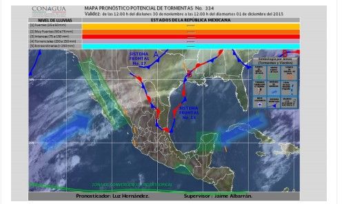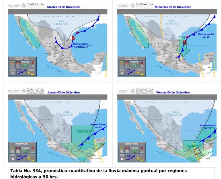 En el pronóstico de lluvia máxima para mañana 1 de diciembre, el SMN señaló que se esperan precipitaciones aisladas (0.1 a 25 milímetros) en Coahuila, Nuevo León, Tamaulipas, Veracruz, San Luis Potosí, Puebla, Hidalgo, Querétaro, Jalisco, Colima, Michoacán, Guerrero, Oaxaca, Chiapas, Tabasco y Quintana Roo.