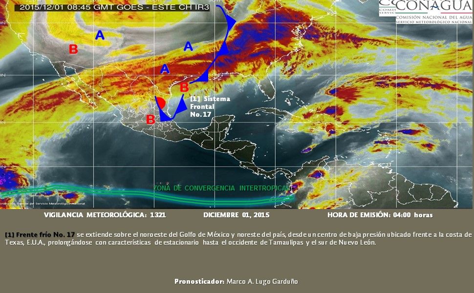 El Servicio Meteorológico Nacional (SMN) informó que para este martes el nuevo frente frío número 17 se extenderá sobre el norte y noreste del país, ocasionando la formación de nublados con potencial de lluvias aisladas en Coahuila, Nuevo León, Tamaulipas, Veracruz, San Luis Potosí, Querétaro, Hidalgo y Puebla.
