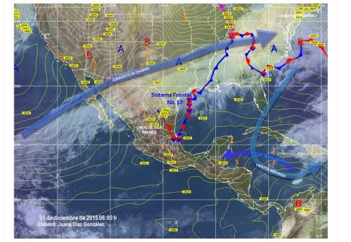 Asimismo, la masa de aire frío asociada al frente, originará un descenso en la temperatura sobre el noroeste, norte y noreste de la República, favoreciendo también formación de nieblas y neblinas durante la mañana en zonas de montaña y de valle de la Mesa del Norte y Mesa Central.