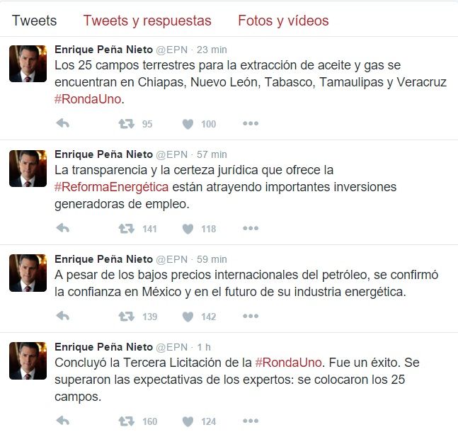 Por su parte, el presidente Enrique Peña Nieto publicó a través de su cuenta de Twitter una serie de mensajes donde congratuló los avances de la licitación de la Ronda Uno así como de la Reforma Energética.