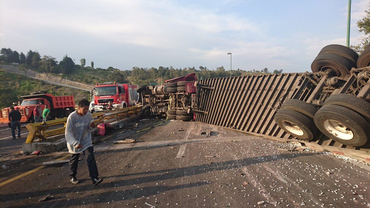 Sobre el kilómetro 31 de la Autopista Chamapa-Lechería, en dirección a Interlomas, un fuerte accidente se registró tras una volcadura de un tráiler que ha provocado el cierre de la circulación.