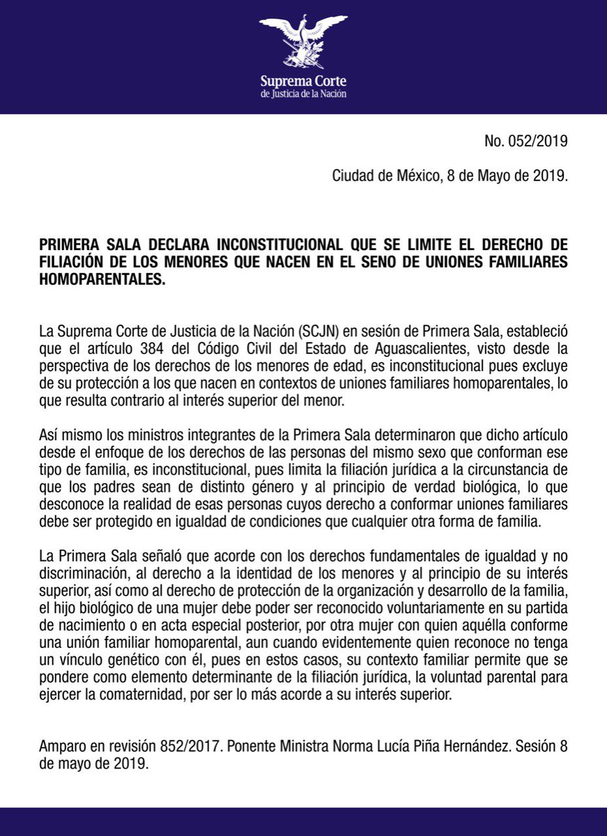 Visto desde la perspectiva de los derechos de los menores de edad, el Artículo 384 del Código Civil de Aguascalientes es inconstitucional por excluir de su protección a los que nacen en contextos de uniones familiares homoparentales, determinó la Corte.