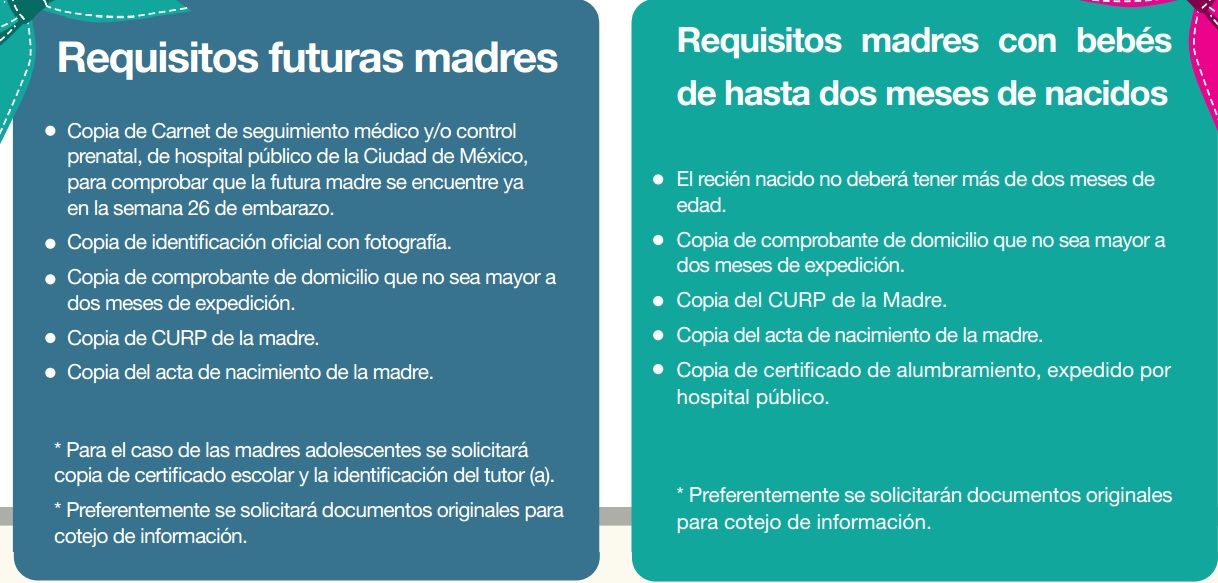 Para madres con bebés de hasta dos meses de nacidos, los requisitos en copia son: comprobante de domicilio, no mayor a dos meses, CURP y acta de nacimiento de la madre, además del certificado de alumbramiento expedido por un hospital público.