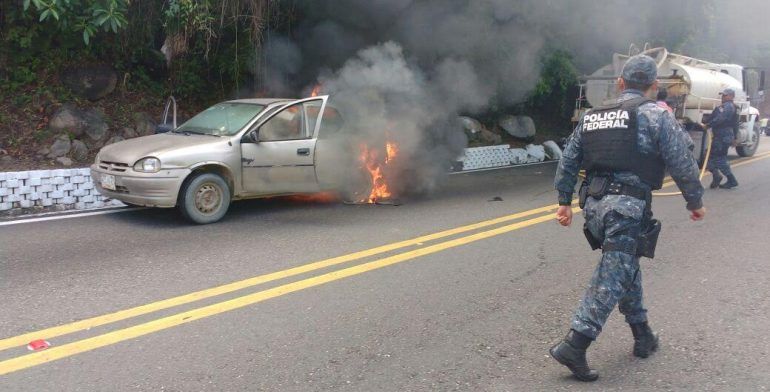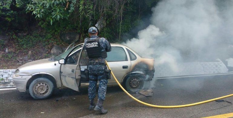 Policías federales de la división Gendarmería auxiliaron a una mujer cuyo se incendió por una falla mecánica en la avenida Escénica, en Acapulco, Guerrero.